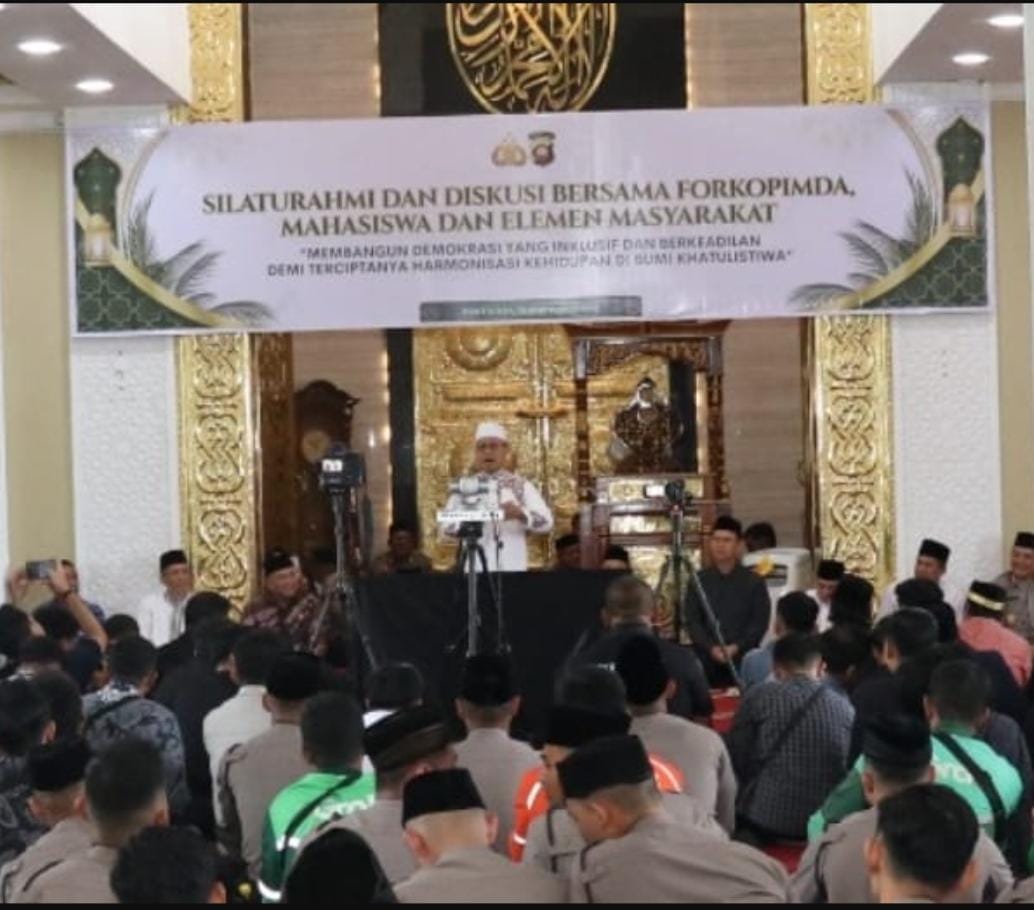 September 20, 2025 Kabar Rakyat Nasional.id, Pontianak Kalbar Guna membangun Demokrasi yang Inklusif dan Berkeadilan demi terciptanya Harmonisasi kehidupan di Bumi Khatulistiwa, Polda Kalbar laksanakan silaturahmi dan Diskusi bersama Forkopimda, Mahasiswa, Dan Elemen Masyarakat, bertempat di Masjid An-Nur Polda Kalbar. (Jumat, 19/9/2025)