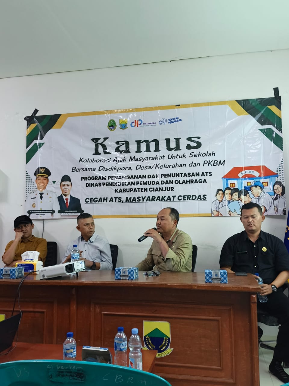 Kegiatan ini melibatkan perwakilan masyarakat, pemerintah desa, serta sejumlah pengelola PKBM. Suasana diskusi terlihat aktif, sebagaimana tampak dalam kegiatan di mana beberapa perwakilan duduk di meja panel dan salah satu pembicara memberikan penjelasan menggunakan mikrofon. Latar ruangan menampilkan spanduk bertema program penanganan dan penuntasan ATS dari Disdikpora Kabupaten Cianjur.